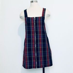 Forever 21 black plaid zipper front with o ring pull pinafore overall dress. This dress has a square neck, is sleeveless, mini length.