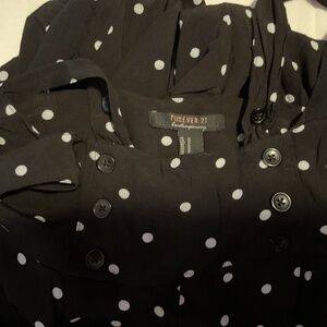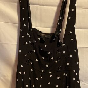 Black with white polka dots, side zipper, buttons in front, flared legs