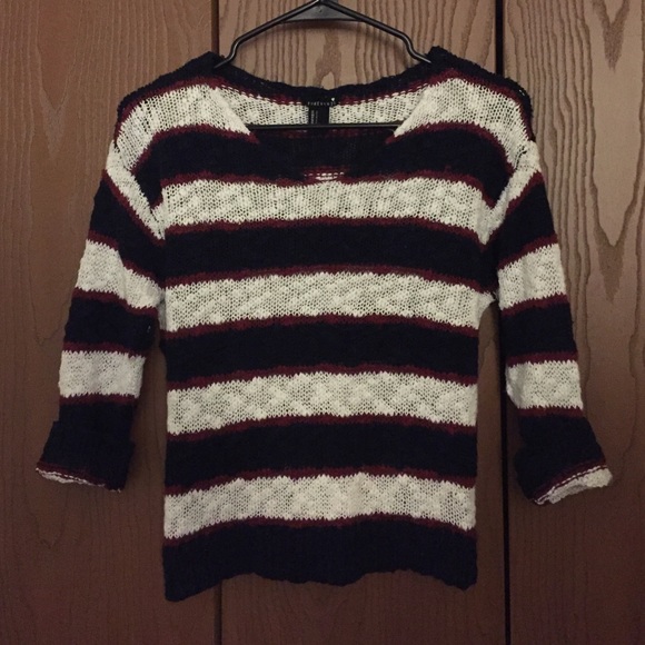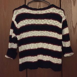 Open knit slightly cropped striped sweater with cream, burgundy, and black stripes and three-quarter length sleeves