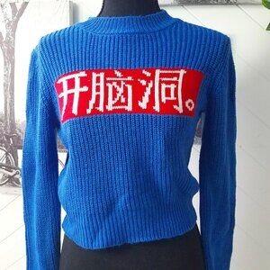 Size S, very soft cotton long sleeve sweater, semi-crop length. The text is Chinese characters but I'm not sure the exact translation -- open your mind? Open to experience? Something like that.