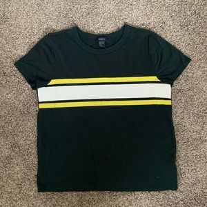 Size medium Forever 21 green, white, and yellow striped t-shirt. This is lightly worn so it is in perfect condition!