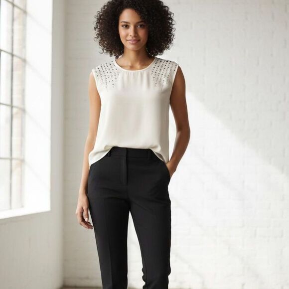 This is a mink condition white chiffon top that’s a very light weight it has beautiful clear stones on each shoulder, barely worn. Definitely runs on the larger side, so could easily fit of size medium also. Capsule wardrobe must have. Dress up or down, under a blazer or cardigan, with a skirt or jeans.