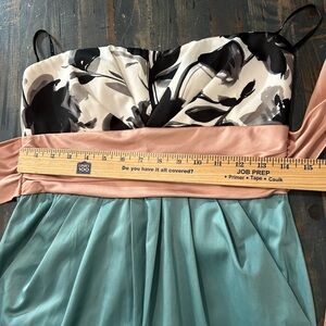 strapless formal dress from Forever 21 features a zipper back and elastic band for a comfortable fit. The dress also has pockets and comes in a beautiful color combination of teal, dusty pink, black, and white. Made of lightweight material with some stretch, this dress is perfect for any special occasion. Vintage but new with tags.