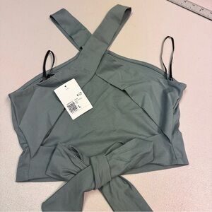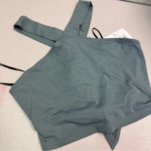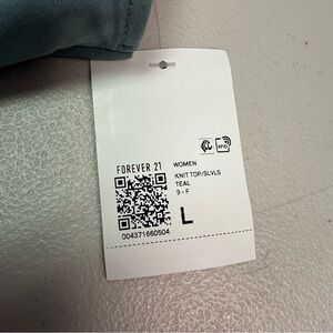 Chic teal knit top. Sleeveless design. Ideal for layering.