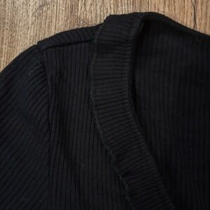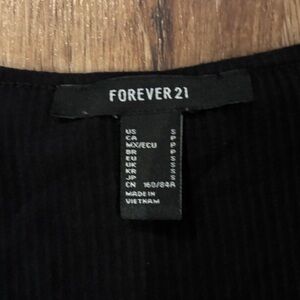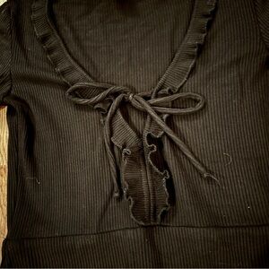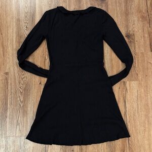Brand: Forever 21, Size: S, Good condition. Black long sleeve ribbed sweater knit dress with a bow in the front, ruffled collar, and lettuce hems. Super comfortable and stretchy, can be dressed up or down.