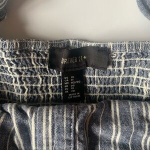 Chambray and white striped top by Forever 21+ stripped denim crop top with tie strap and button details down the fronts. The straps are adjustable and can be tied to any length. The back is stretchy and super comfortable. Pair it with a cute skirt for a night out or with some white jeans for a girls day out! features stretchy back and adjustable tie straps. Fun and cute! EUC.