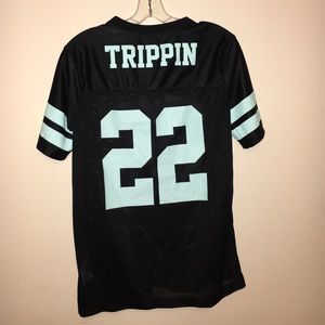 This mesh jersey says 22 on the front and back with trippin on the back. It is black with aqua green lettering
