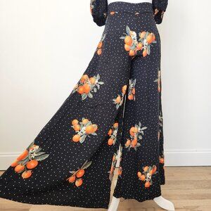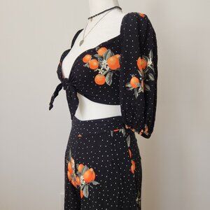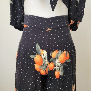Forever 21 Two Piece Set Orange Fruit Crop Top Wide Leg Pant Black Boho Dot XS M