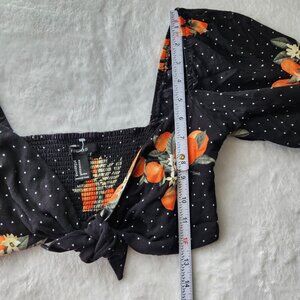 - Black crop top & flowy pants in a fun novelty print with oranges, polka dots + floral