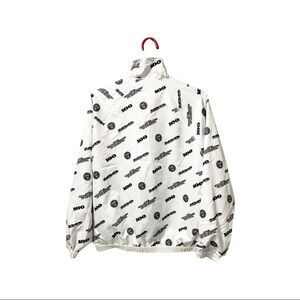 Forever 21 (United States of America and Department of Treasury) printed jacket. Wind breaker material. In excellent used condition. Elastic waist and wrist. Missing the drawstring. Zip neck and kangaroo pockets. Somewhat oversized. Listed as a small.
