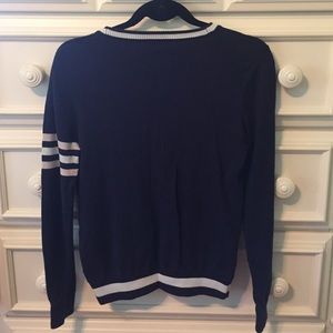 This lightly worn navy cardigan with baby pink accents is the perfect vintage campus clothing statement!