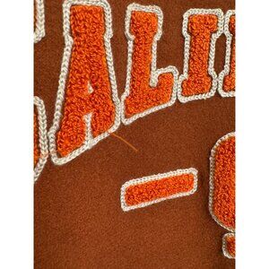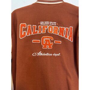 This Forever 21 varsity-style jacket features a rich brown body with cream sleeves, detailed with striped ribbed trims and embroidered California athletics lettering on the back for a classic sporty look.