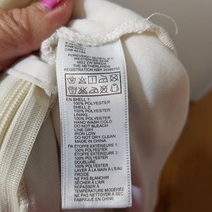 Excellent pre-owned condition. No damages, stains, or wear. Features a five buttoned front, but has a zipper on the left side. 100% Polyester, sheer on the top, with a polyester liner layer as well. Soft and flowy. Skirt comes down to just above the knees, full measurements in the last picture. Color is white with black polka dots and trim.