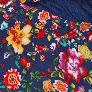 Mid-length flowy skirt with a blue base and floral pattern. The waistband is made of elastic and the skirt is made of soft, comfortable cotton. Perfect for summer!