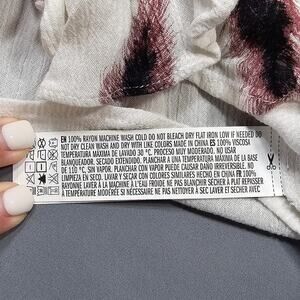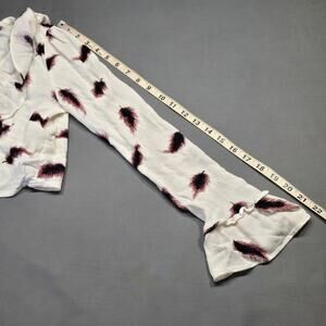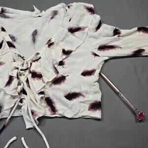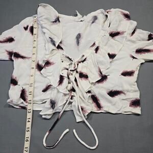 Forever21 Women's Shirt Size S White Purple Multicolor Feather Printed Crop Top Tie Ruffled Plunge V-Neck Classic Long Sleeves Lightweight Blouse