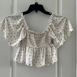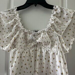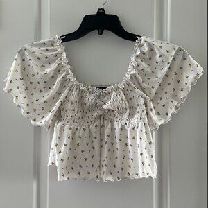 Forever 21 White Floral Smocked Crop Top With Flutter Sleeves S