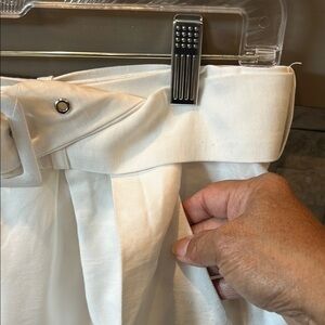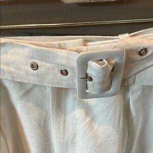 High waisted white shorts that have a dressier look. Attached belt, 2 pockets and folded cuff. Zipper and hook