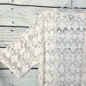 Forever 21 Contemporary women’s lace kimono, size Small. Sheer white embroidered lace with boho fringe hem. Open front, 100% polyester. Great for layering over tanks, swimsuits, or festival outfits.