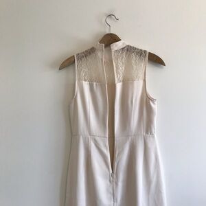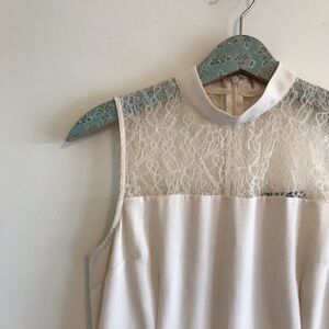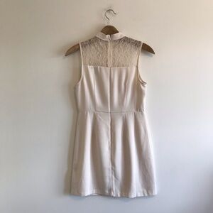 Features: off white, mini dress, high neck with lace panel detail, sleeveless.