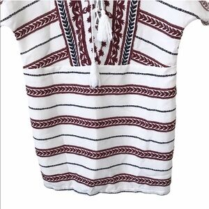 Forever 21 Contemporary white cover up style dress with burgundy printed patterns throughout. Has a deep v neckline, with a tie, corset lace up detail. Preowned but in good condition.