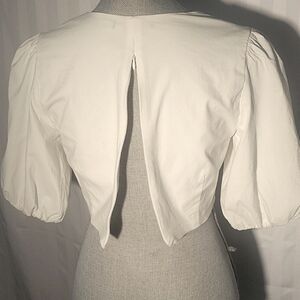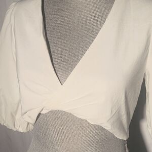Forever 21, White, V-Neck, Cropped, Knot Front, Puffy Sleeves Blouse, Size: M, 75% Rayon, 22% Nylon, 3% spandex, lining: 100% Polyester, hand wash