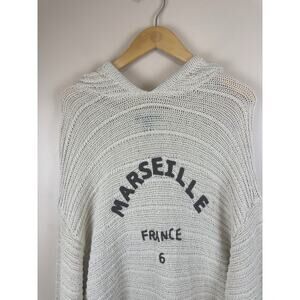 Women’s Forever 21 hooded sweater, size L, in cream, with “Marseille France 6” embroidered on the front. Features a small stain on the hood. Casual and comfortable design, perfect for relaxed or street-style looks. Made from soft cotton and polyester.
