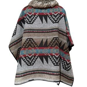 This is a gorgeous Pancho style cape by Forever 21 Aztec Blanket Cape has a faux fur removable collar with toggle closure. It is in excellent gently used condition. Size Medium