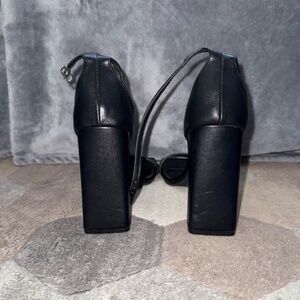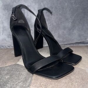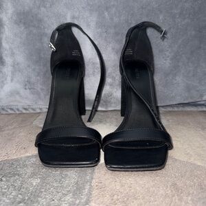 These are Women's Black Open Toe High Heels from the brand Forever 21. These are black and are a Women's Size 10 US/CA. These shoes were only worn once and are very comfortable with a faux leather material. These shoes are great for a formal dance, wedding, or a fancy dinner!