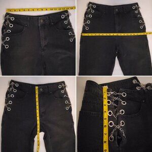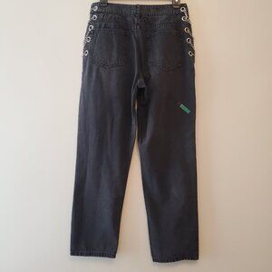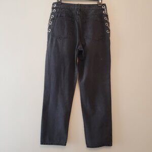 Forever 21 High-Rise Straight Leg Relaxed Fit Denim Jeans, Featuring High-Polish CrissCross Curb Silver Toned Chain Detailing at Hips with Grommets, Four-Pockets, Zip Fly and Button Closure, Faded Black, 100% Breathable Cotton