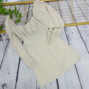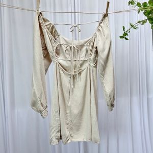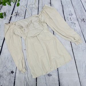 Long Sleeve mini linen dress by Forver 2 in tan. Dress ties and is open in the back. There is a manufacture defect with the ties. Please see pictures