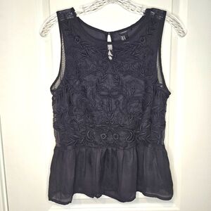Forever 21 Floral Embroidered Sleeveless Sheer Peplum Peasant Shell with a Fitted Waist and Side Zip Closure.