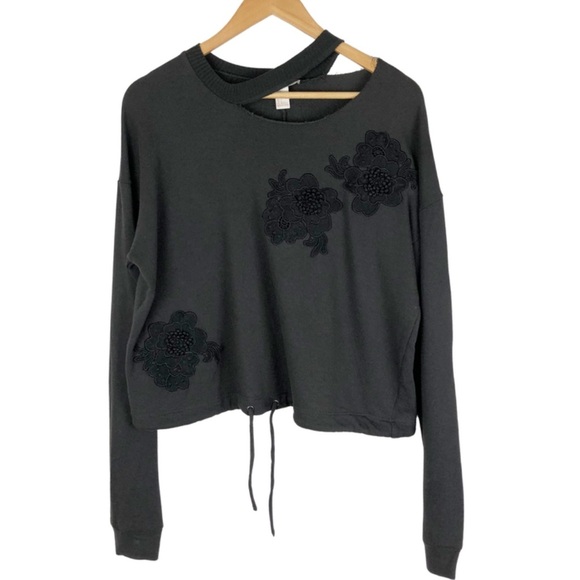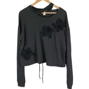 Forever 21 Long Sleeve Sweatshirt. Distressed crewneck, long sleeves. Cropped length with adjustable drawstring hem. Velvet floral patches. Size S. Inside tag cutout. Made in China.
