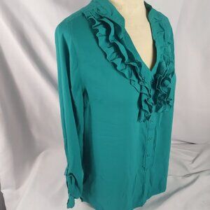 Forever 21 Womens Green Long Sleeve Button Down Ruffle Blouse Size Large