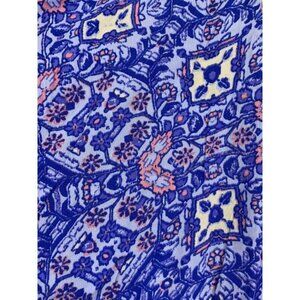 A women's kimono cover-up from Forever 21. The kimono is in blue with a multi colored geometric pattern, open front, short sleeve, fringe hem, and the kimono is new with tags.