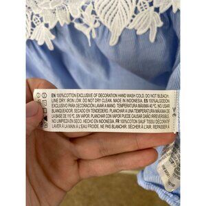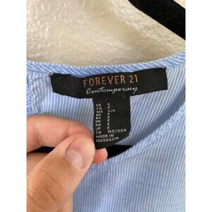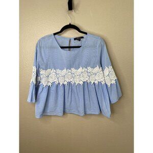 This Forever 21 top features a delicate light blue pinstripe design, bell sleeves, and intricately embroidered white floral lace detailing across the front and sleeves. Made from soft, lightweight cotton, this blouse offers comfort and breathability. The keyhole button closure on the back adds a subtle touch of sophistication.