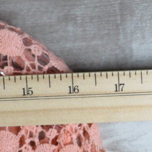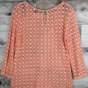 Pre-Owned, Good Condition! Medium. A crochet knit sweater featuring an open knit, long sleeves, and a crew neck. 90% Cotton/10% Polyester. Coral Color. I noticed some of the knitting separated (see pics) 4/5.