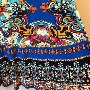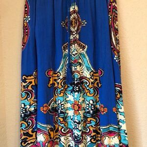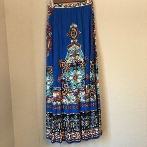 Forever 21 Size Medium Cobalt Blue Ethnic Print Maxi Skirt. In pre-owned but very good condition. Skirt has elastic waist line, faux waist drawstring tassels and 100% rayon. Contains colors of blue, pink, black, green and orange. Approximate measurements: waist line is 25 inches and length is 38.5 inches.