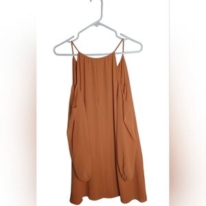 Forever 21 blouse, size XS, in excellent used condition (EUC). This trendy top features a warm camel-brown color, a stylish cold-shoulder design with delicate spaghetti straps, and long puffed sleeves. The flowy silhouette and subtle V-neckline with tie details add a chic and feminine touch, perfect for casual or dressy occasions.