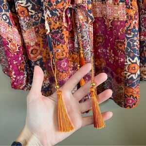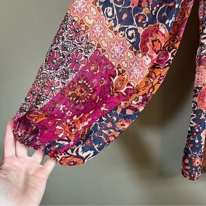 Forever 21 women’s pink and orange long sleeve romper. Cinches at waist.