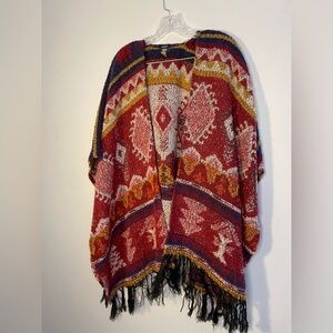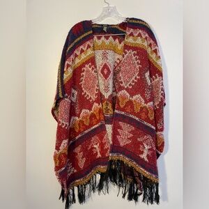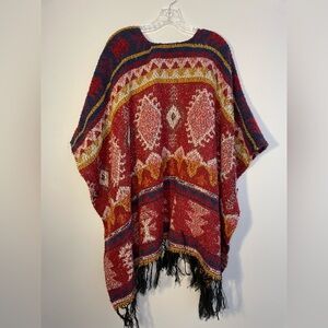 Forever 21 Women's Poncho Western Aztec Fringe Red Blue Gold White One Size EUC