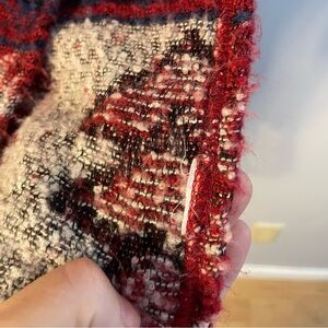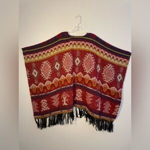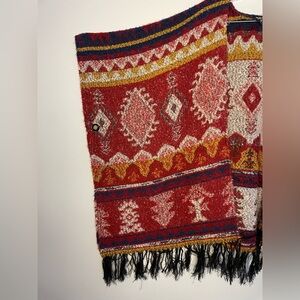 This poncho is so soft!! Made by Forever21. Labeled as One Size. The fabric tag is cut out so I don't know what fabric this is made of - but it is soft and cozy. Could be worn as a poncho or shawl. Has one button under each armpit to create arm holes (or can be left unbuttoned). Fringe along bottom of poncho/shawl. Cool designs that folks often describe as western or Aztec. In excellent used condition.