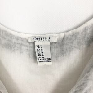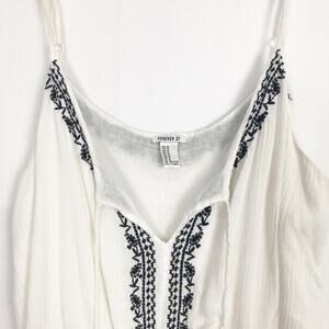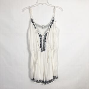 Forever 21 embroidered off-white romper. Embroidered. Lace tie front tassels. Elastic waist. Side pockets. Gauzy fabric. In very good used condition. No visible stains. No tears or holes.