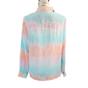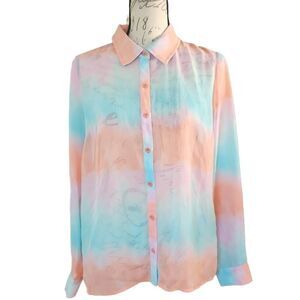 Forever 21 Women's Size Medium Pink Blue Sheer Button Down Long Sleeve Shirt