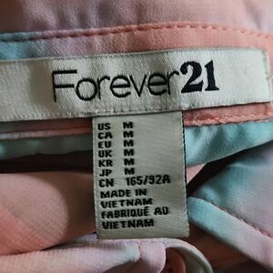 Add a touch of femininity and flair to your wardrobe with this Forever 21 blouse. Featuring a soft blend of pink and blue hues, this size medium shirt boasts a sheer, flowing fabric with a classic button-down style. Perfect for layering or wearing on its own, this top offers endless styling possibilities.