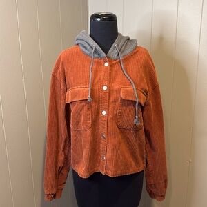 Forever 21 Women’s Small Cropped Boxy Brown Hooded Jacket Corduroy Snap Button