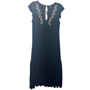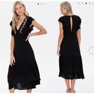 Forever 21 Womens Woven Maxi Dress Small Black Multicolor Embroidered Ruffle