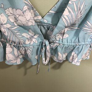 Up for sale is this Forever 21 Women's Woven Sleeveless Top Light Blue Tropical Flowers Size Small. New with tags. 100% polyester.