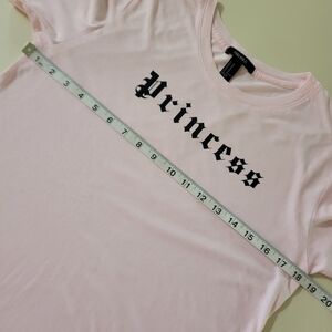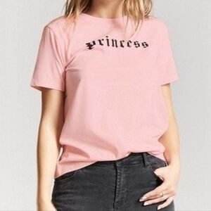 This pink crewneck top by Forever 21 has graphic Princess on the front in bold black font. Soft cotton jersey fabric and classic styling with a straight hem and short sleeves. Excellent condition.
