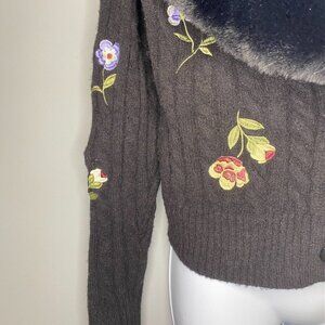 Forever 21 Y2K Floral Faux Fur Emboidered Cableknit Long Sleeve Cardigan Size M