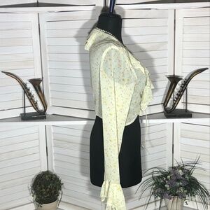 This Forever 21 cropped blouse features a light green floral print with romantic ruffle trim. It is designed with long sleeves, a tie-front closure, and a lightweight semi-sheer fabric, bringing a dreamy vintage-inspired look to your wardrobe.